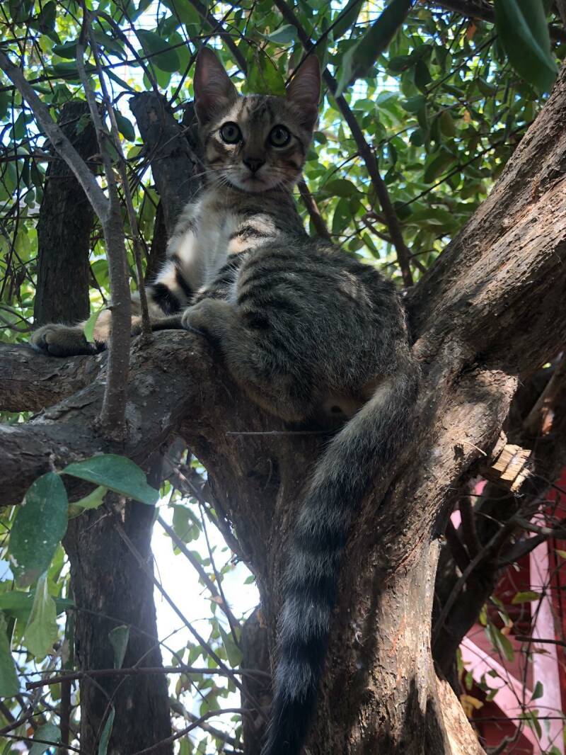Tijdens een wandeling bij Ascension, samen met Tommy, Zanzi en Fenna, kwam Dora op ons pad. Een ontmoeting die haar leven en dat van haar gezin, voorgoed zou veranderen. Ze was zo mager en compleet uitgedroogd. Met ORS en veel olijfolie en natvoer moesten haar organen weer langzaam op gang komen.