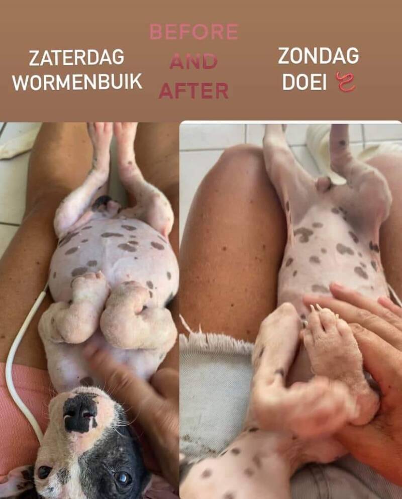 Angel had een flinke wormenbuik. Na een ontwormingskuur en een paar poepexplosies later is haar buik helemaal plat! Wat een verschil, hè!