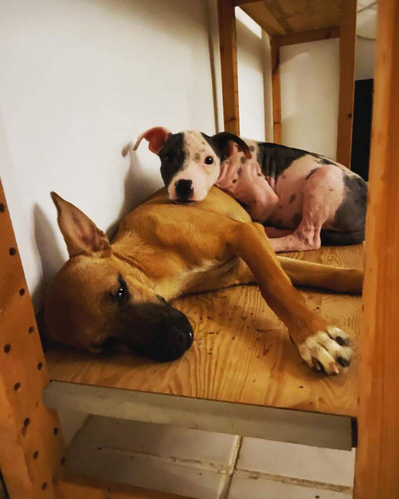 Angel heeft nu gezelschap gekregen van Sunsetpup Lissy! Beide meiden zitten nu samen in de vrijwilligersstudio om te socialiseren.