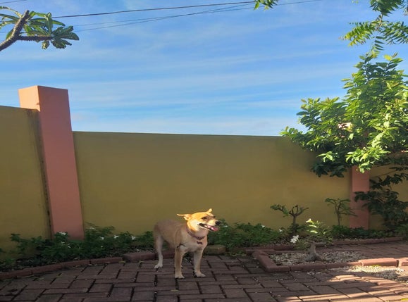 Gina is gevonden tijdens een avondje uit in een pizza restaurant met de stagiaires Eefje en Nadieh en een aantal vrijwilligers. Toen we in het donker naar huis reden, lag er een pup voor dood langs de weg. Tamara besloot te stoppen. Daar lag onze puber van een paar maanden oud aangereden door een auto. Het was ontzettend heftig om te zien, haar hele borst was opengescheurd tot het bot.. Haar evenwichtsorgaan was zichtbaar beschadigd, ze kon haar ogen niet stil houden die gingen ongecontroleerd van links naar rechts. De dierenarts werd met lichtelijk protest uit zijn bed gebeld, dankbaar dat hij toch wilde komen voor Gina! Wij waren totaal in shock. Het zag er zorgelijk uit maar toch had de arts hoop voor Gina. Hij heeft de wond diezelfde avond schoongespoeld en dicht geniet. Een paar dagen later is de dode huid weggeknipt met een plaatselijke verdoving en de wond opnieuw gereinigd. Ze was te zwak voor een operatie.! Na veel rust, antibiotica, pijnstillers, zorg en liefde, is ze weer helemaal hersteld. Na een aantal dagen liep ze wonder boven wonder rond, gammel maar ze liep. Stagiaire Eefje was zo ontzettend lief voor Gina, er werd dag en nacht over haar gewaakt en met de hand stukjes gekookte kip gevoerd. Na enkele weken besloot Gina spullen te gaan verzamelen onder bed, zo schattig denk daarbij aan zelf gevonden: touwtjes, papier en alles wat ze kon vinden op het voorterrein en de studio was ze vrij mocht rondlopen! Ze is super lief en heeft een heel zacht karakter. Gina was dol op de puppy's: Paco, Safira en Chica en speelde graag met ze in de tuin. Inmiddels wonen haar vriendjes alle drie in Nederland en zijn succesvol herplaatst. Gina is nog wat verlegen en afwachtend richting mensen maar met geduld zal ze steeds socialer worden en uiteindelijk een band kunnen opbouwen op basis van vertrouwen bij een nieuwe eigenaar. Ervaring en geduld is wel gewenst bij de adoptie want dit hondje zal opgeleid moeten worden in baby steps