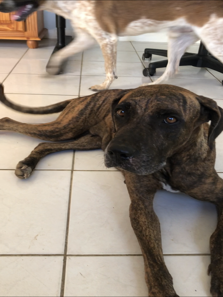 We hebben haar meteen meegenomen en ze mocht rustig bijkomen in de vrijwilligersstudio. Ze kreeg eten, en is 21 dagen aan de Doxy geweest tegen de karpattenziekte. Bonita moest flink aansterken, want ze was flink mager, zeker voor zo'n grote hond! Diezelfde avond kwam Pablo bij haar wonen, we vermoedden dat zij samen zijn gedumpt.