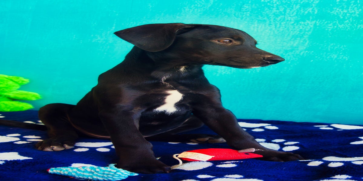 Macho, een mix van moeder Westpointer Ayla (aanwezig op Curaçao) en vader Dobermann, is een ware knuffelbeer die nog steeds denkt dat hij een schoothondje is.
